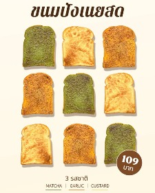 ใช้แป้งญี่ปุ่นและเนยแท้นิวซีแลนด์ แผ่นหนา 3 ซม. กรอบนอกนุ่มใน มีให้เลือก คัสตาร์ด กระเทียมเนย และมัทฉะ เพียงชิ้นละ 109 บาที